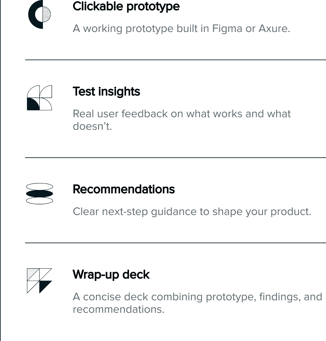 A clickable prototype built in one focused sprint, so you can show and test your idea before you commit.